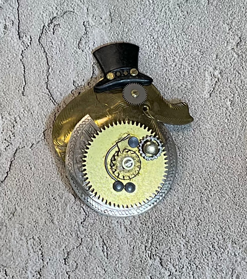 Mr Elephant is a unique, upcycled vintage earring to a pin! I added an antique clock gear, an antique pocket watch crown and gear, and a top hat. Mr Elephant is going out for a night on the town.