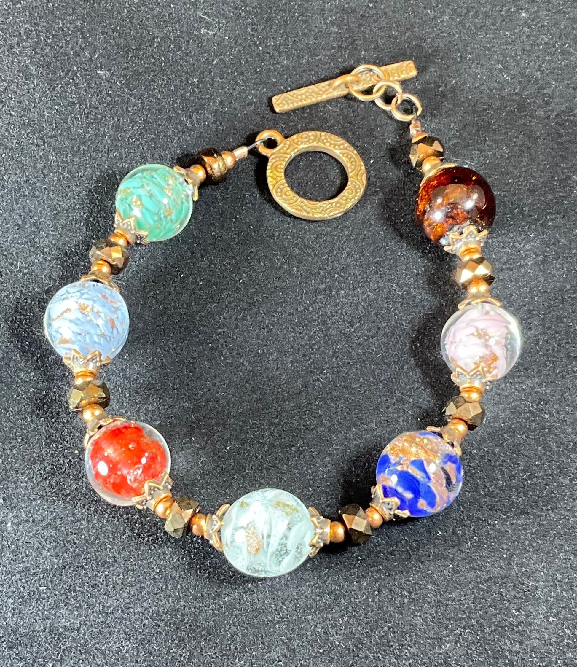 Embrace sustainable style with our vintage Czech recycled glass bracelet. Each glass ball bead is from a broken vintage necklace, repurposed into this lovely and fun to wear bracelet. accented with copper details and a gorgeous, no-nickel pewter clasp. Dare to make a statement with this bold and unique piece!