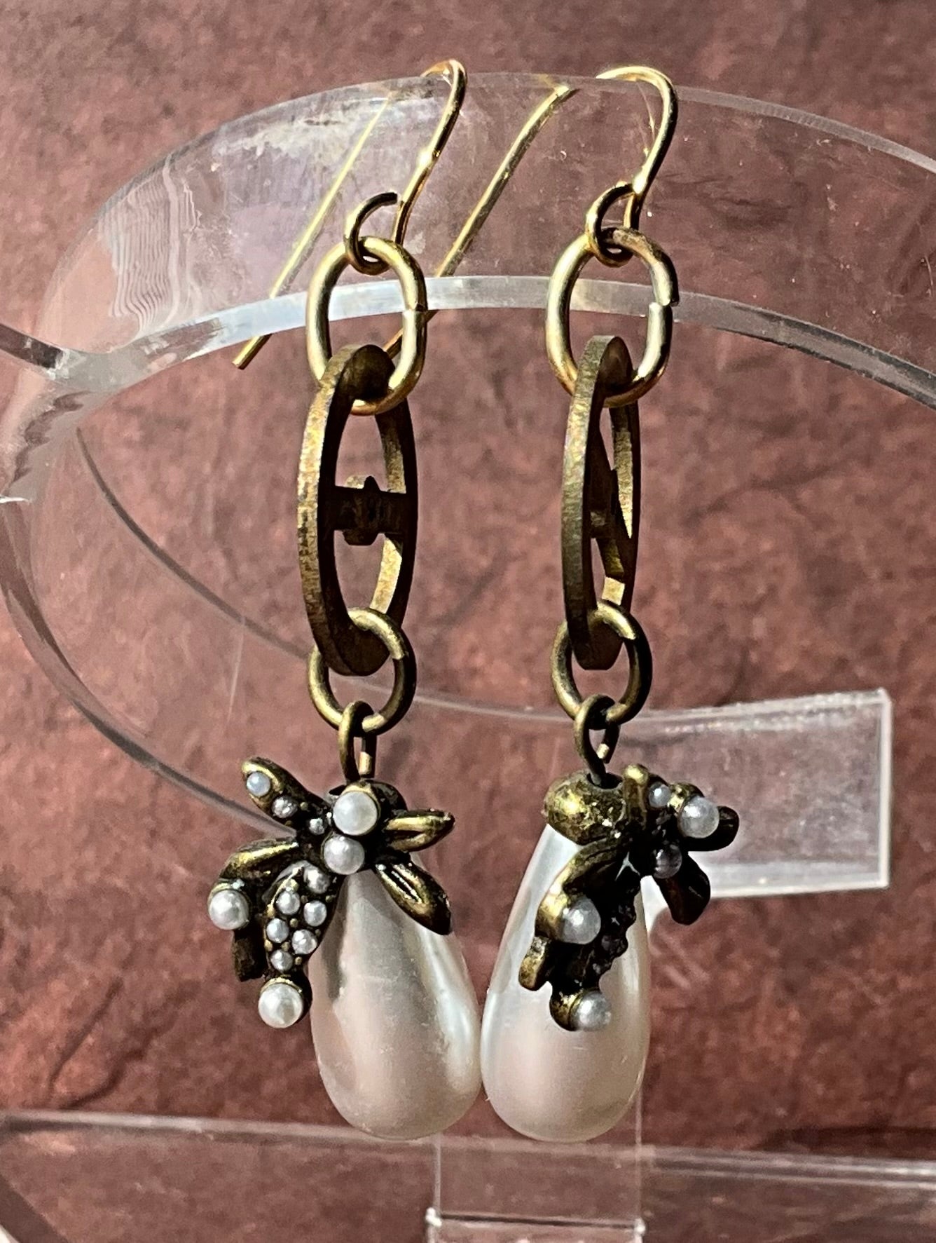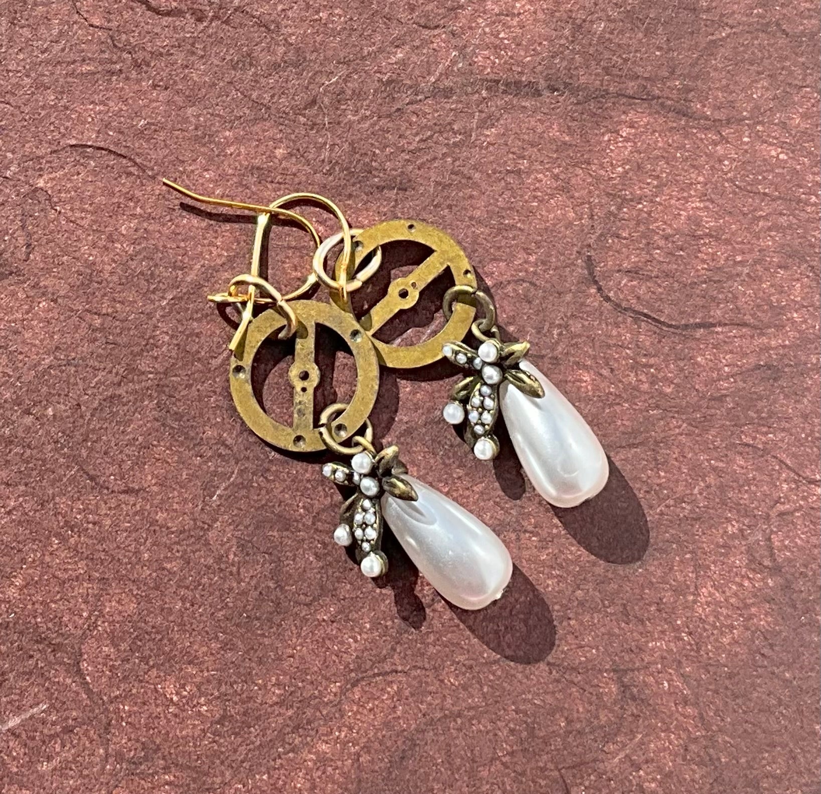 fun pocket watch gears with repurposed pearl drops. the drops are from recycled jewelry. I wish I had more of these, with the little bows and crystals they are so cute. They make great hard and soft and sassy earrings.