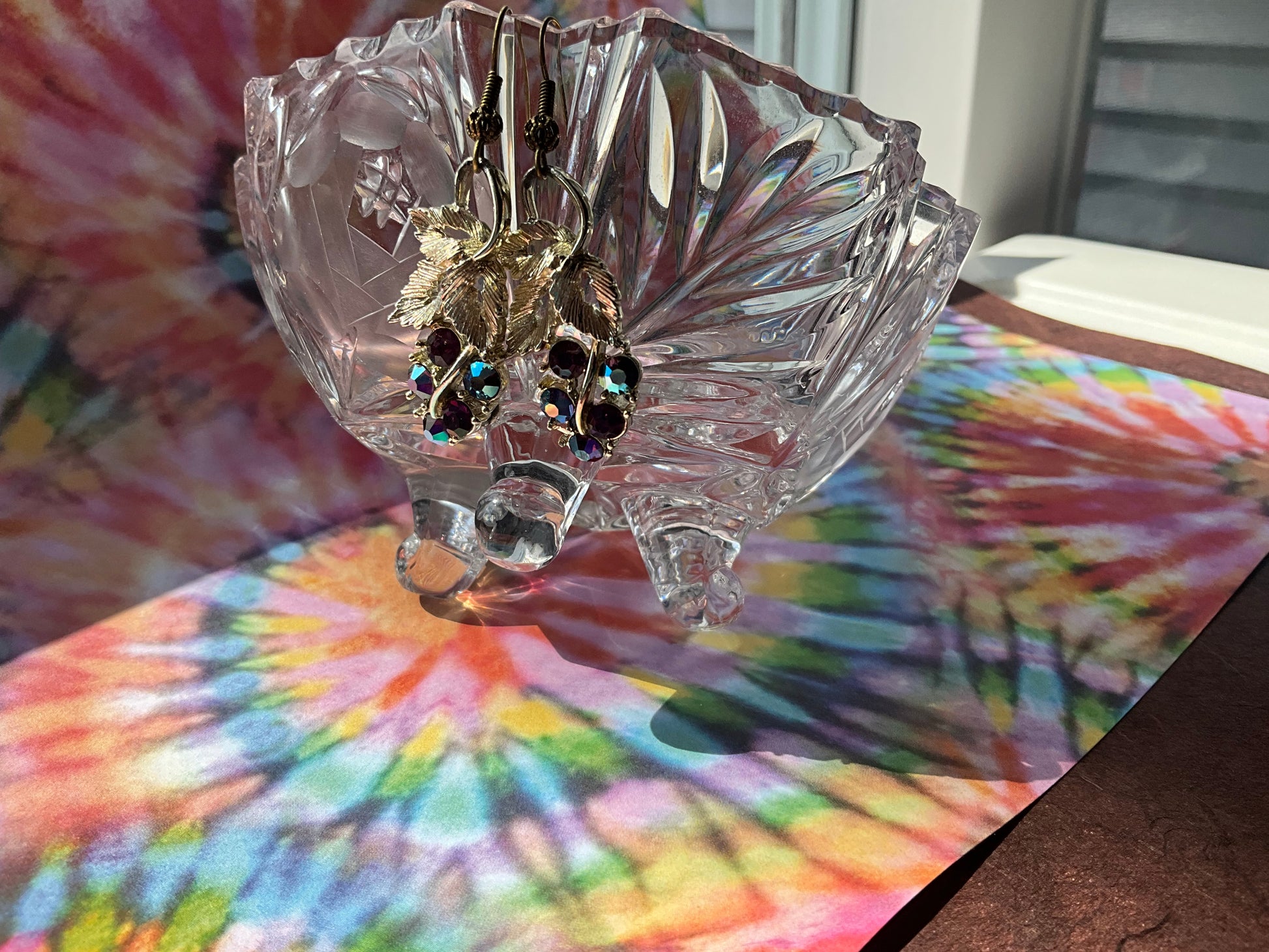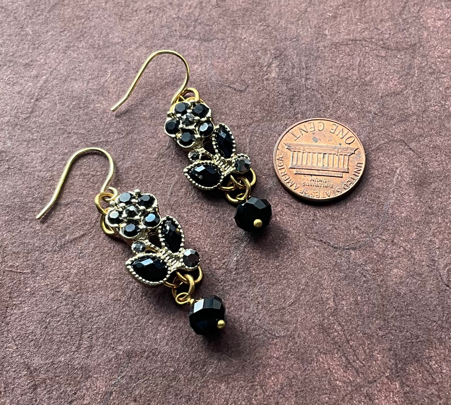 parts from a necklace, probably 1960's. I've carefully replaced missing rhinestones, and made them into earrings on antique looking brass earwires.